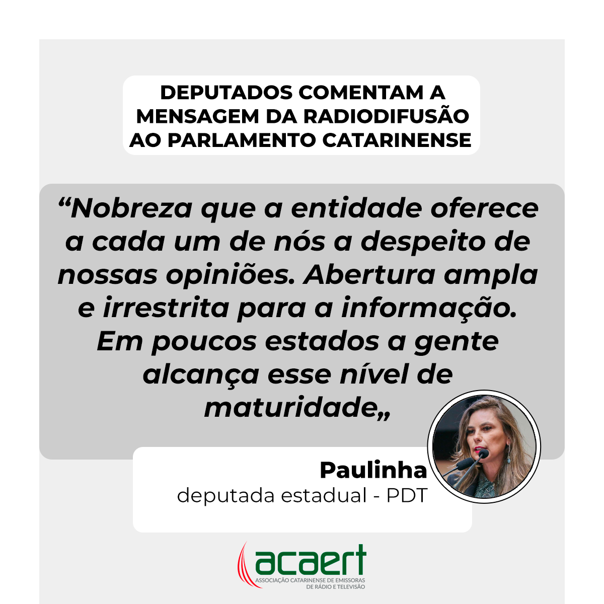 Diversos parlamentares fizeram questão de destacar a atuação da ACAERT em prol da sociedade catarinense e do segmento da comunicação