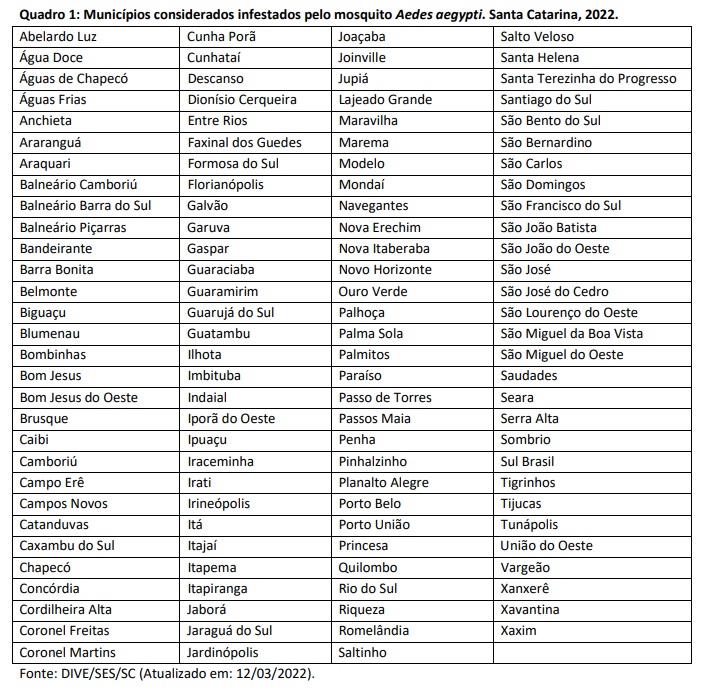Confira a lista dos 119 municípios infestados pelo mosquito transmissor da dengue em SC:
