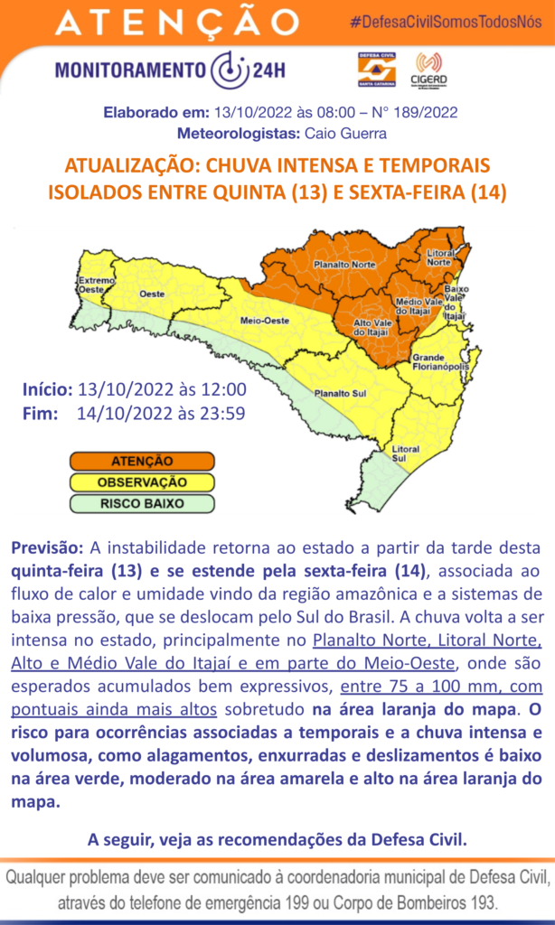 Regiões do Planalto Norte, Litoral Norte e Alto e Médio Vale do Itajaí devem receber os maiores volumes de chuva e são consideradas de risco alto para ocorrências como alagamentos, enxurradas e deslizamentos.