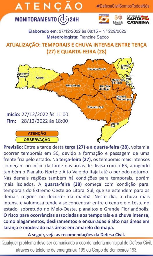 28/12/2022Confira o alerta emitido pela Defesa Civil de SC: