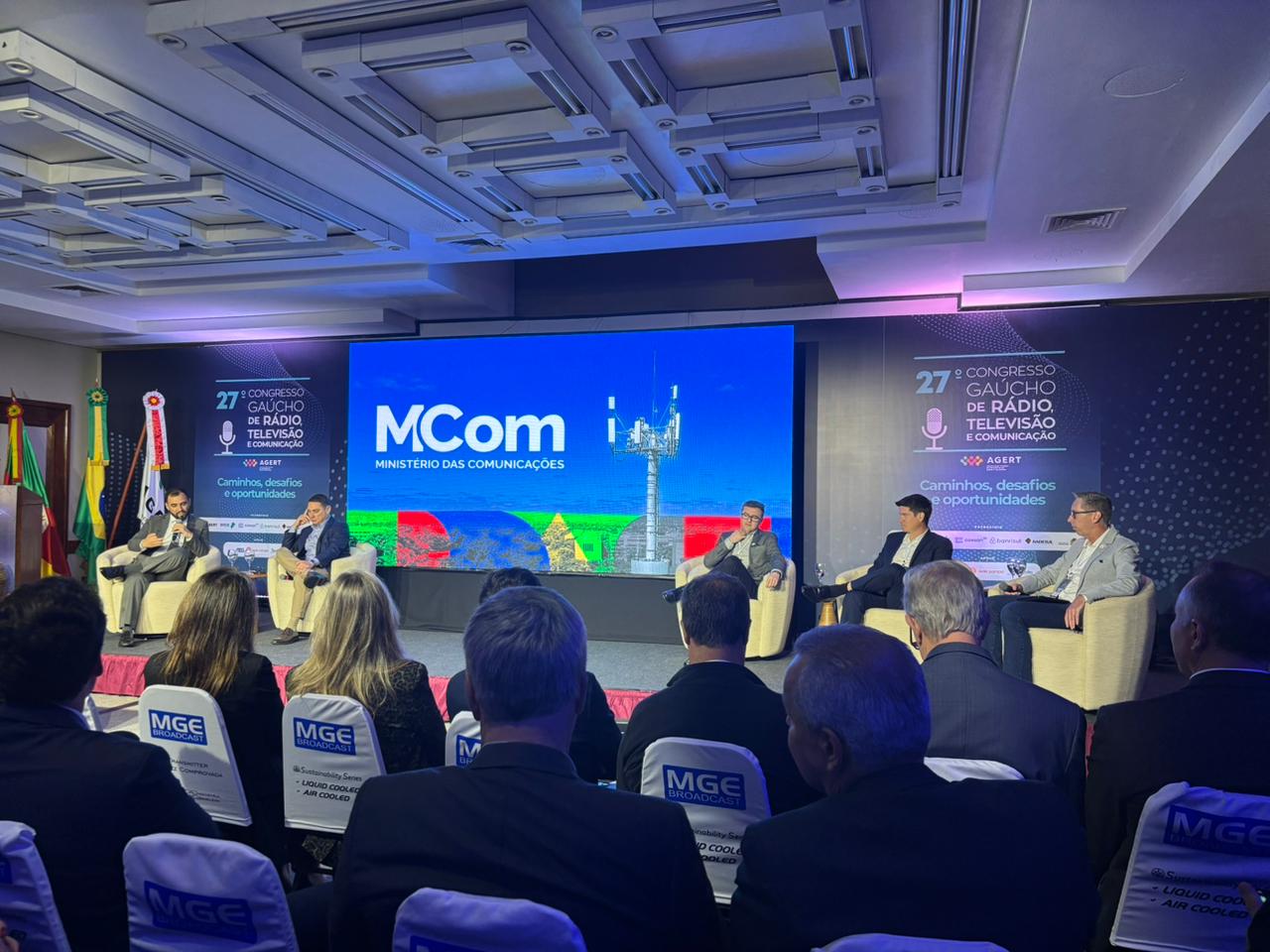 Destaque para o painel ‘Desafios do setor e agenda regulatória’, com Cristiano Flores (presidente-executivo da Abert), Wilson Diniz Wellisch (secretário de Radiodifusão do MCom), Caíque Agustini (Comitê Executivo Institucional da ABERT), Beto Amaral (VP Executivo do Grupo SCC e VP de Inovação da ACAERT) e mediação de Alessandro Heck, presidente da Agert. O painel foi realizado na manhã desta segunda-feira (27).