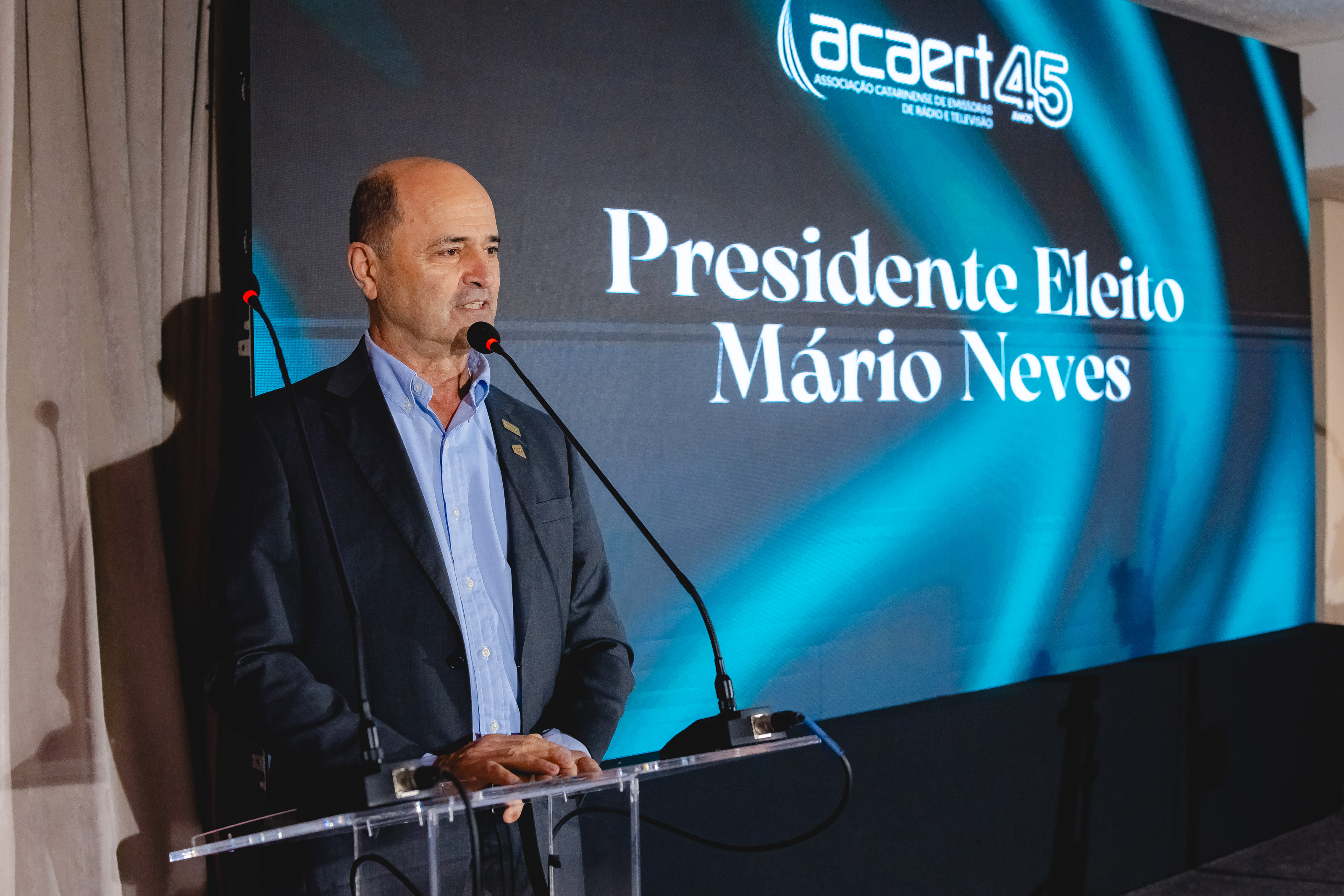 No início do jantar, a ACAERT apresentou Mário Neves, presidente-Executivo da NSC, como o presidente eleito da entidade. A eleição ocorreu durante Assembleia Geral Ordinária – AGO, realizada no mesmo hotel, no período da tarde. O mandato de três anos dos novos dirigentes começa em janeiro de 2026 e a posse está marcada para fevereiro. Mário Neves será o 14º presidente da ACAERT. Atualmente, ele ocupa a Vice-Presidência Administrativo da entidade. Ele sucede ao radiodifusor Fábio Bigolin, da Rádio Clube, de São Domingos, que passa a integrar o Conselho Superior da entidade.