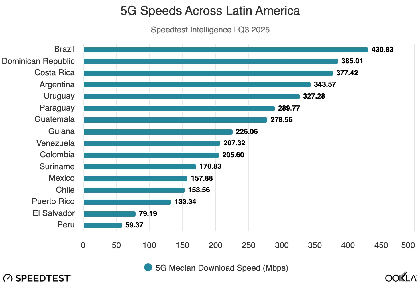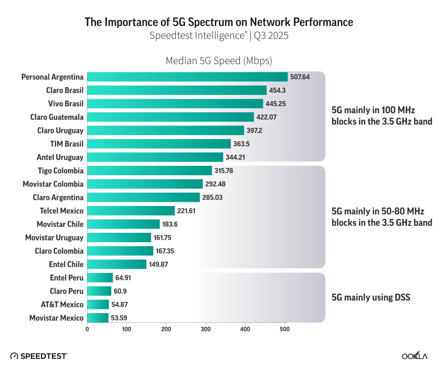 De acordo com o relatório, provedores de 5G com 100 MHz de espectro na banda de 3,5 GHz (como Personal Argentina, Claro Brasil e Vivo Brasil) "geralmente oferecem velocidades de 5G acima de 300 Mbps".