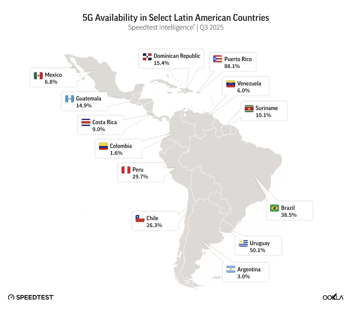 Segundo a Ookla, essa taxa é de 38,5% no País. Embora seja a terceira maior da América Latina, atrás apenas de Porto Rico (88,1%) e Uruguai (50,1%), o índice permanece bem abaixo do registrado nos Estados Unidos (73,2%) e no Canadá (75,2%), que também possuem extensos territórios.