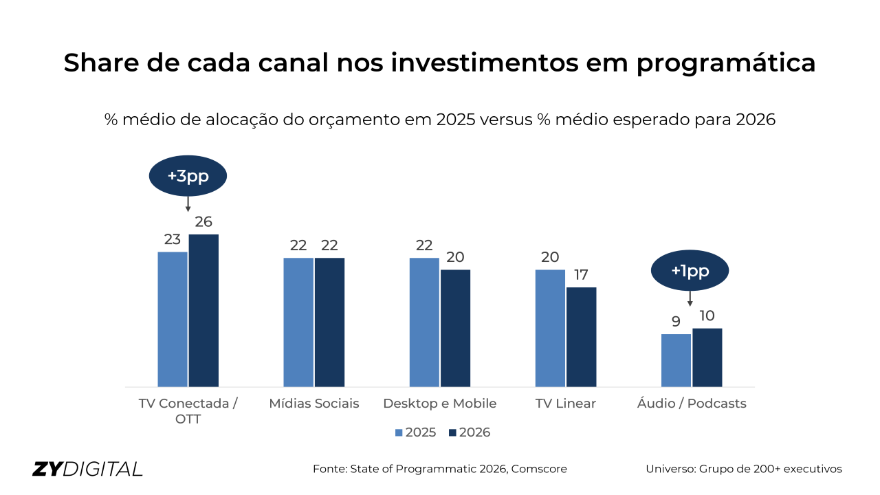 Ao mesmo tempo, é esperado um crescimento das fatias capturadas pela CTV e pelo áudio, em contraste com a diminuição das participações dos demais canais, em particular, a TV linear e o rádio tradicional. O share da CTV nos investimento de programática deve subir de 23% em 2025 para 26% em 2026, enquanto áudio e podcasts passam de 9% para 10%.