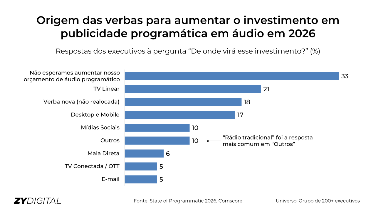 O crescimento do canal, portanto, ocorre principalmente por realocação dentro do mix de mídia, e não por novos aportes. Entre os que ampliam a presença em áudio programático, a TV linear aparece como principal origem das verbas transferidas (21%), seguida por novos recursos (18%) e pela migração de display digital em desktop e mobile (17%). Outras fontes de orçamento redirecionado incluem redes sociais (10%), mala direta (6%), e-mail (5%) e até CTV/OTT (5%).