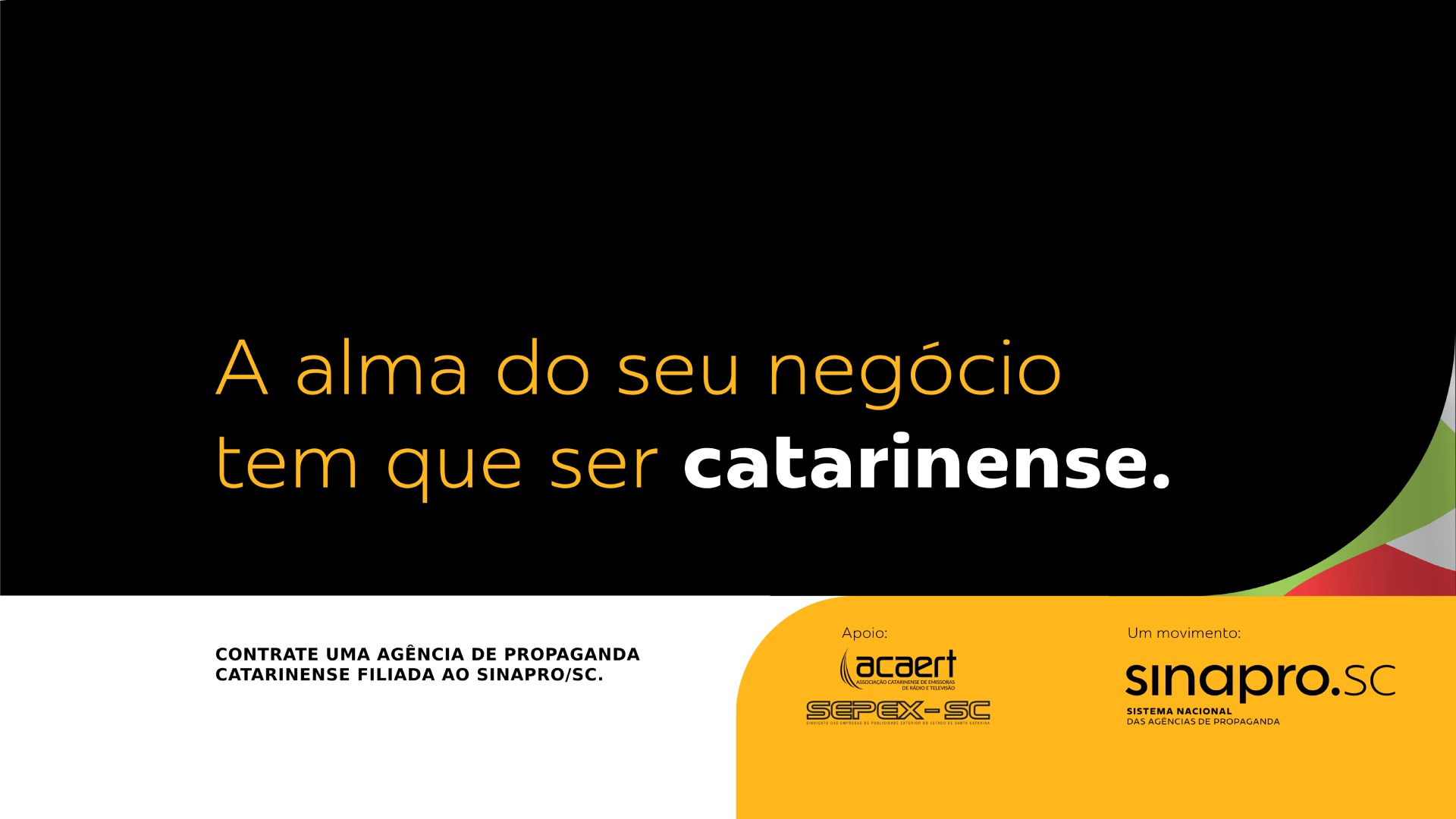A campanha conta com o apoio da ACAERT. Para o vice-presidente de Relacionamento com Governo e Mercado da entidade, Carlos Amaral, Santa Catarina possui um mercado publicitário qualificado e competitivo. “Nós temos grandes e competentes agências que entregam um belo trabalho. A ACAERT está junto neste movimento em prol do mercado”, afirma. Amaral também reforça a importância de fortalecer as parcerias locais. “Queremos que as empresas catarinenses possam crescer, ainda mais, ao lado de quem entende dos nossos negócios. Para isso podem contar com o ecossistema da comunicação catarinense”, completa.