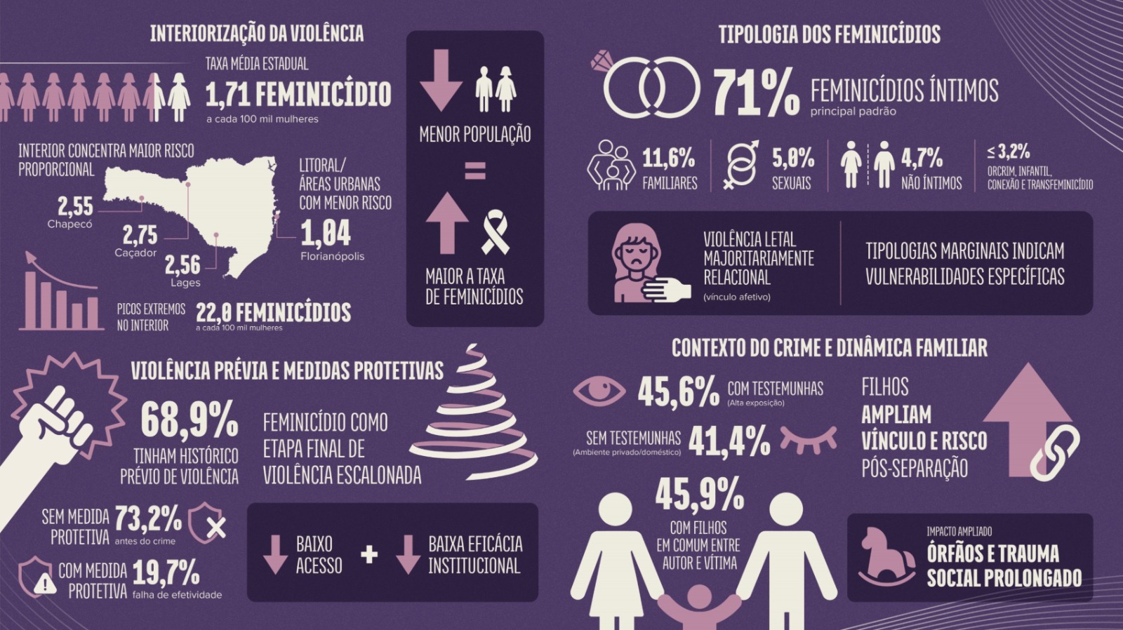 O Ministério Público de Santa Catarina – MPSC lançou nesta segunda-feira (30) o ‘Mapa do Feminicídio’, que cruza e organiza dados oficiais, reunindo análises que ajudam a dimensionar como a violência letal contra mulheres se manifesta no Estado, a partir da identificação de padrões, fatores de risco e impactos sociais associados aos crimes.