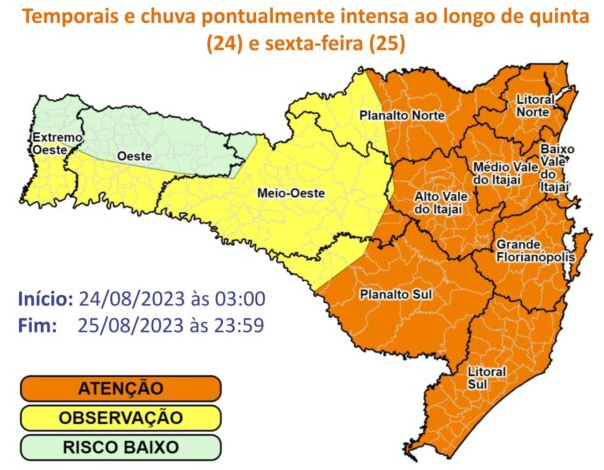 Defesa Civil de SC alerta para temporais nesta quinta (24) e sexta-feira (25) no Estado