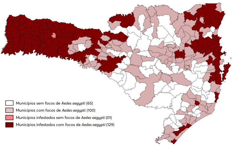 Onze óbitos foram registrados no período, conforme a Diretoria de Vigilância Epidemiológica do Estado. Em 2022, são 41 mortes causadas pela doença e mais de 42 mil casos. Santa Catarina tem 130 municípios infestados e 59 em nível de epidemia