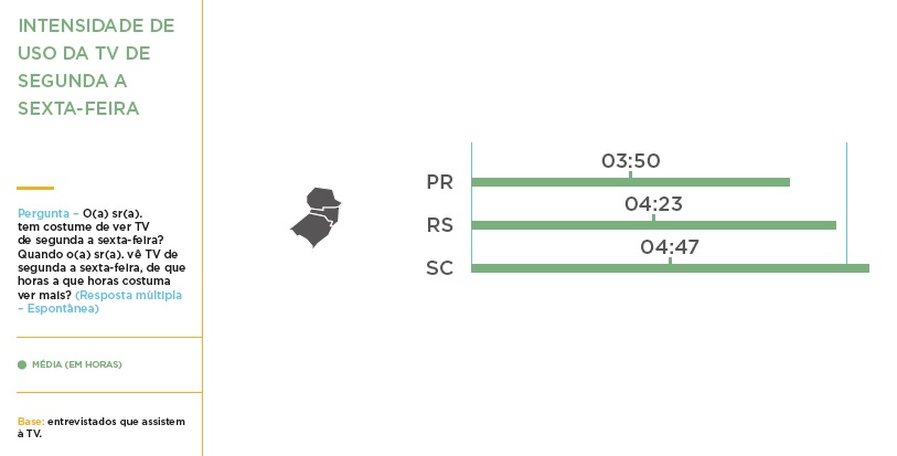 Quando a pesquisa perguntou sobre o consumo do conteúdo veiculado pela TV aos finais de semana, os catarinenses também superam os moradores dos estados vizinhos. Em Santa Catarina, os entrevistados afirmaram que assistem, em média, 4 horas e 51 minutos de TV entre o sábado e o domingo.