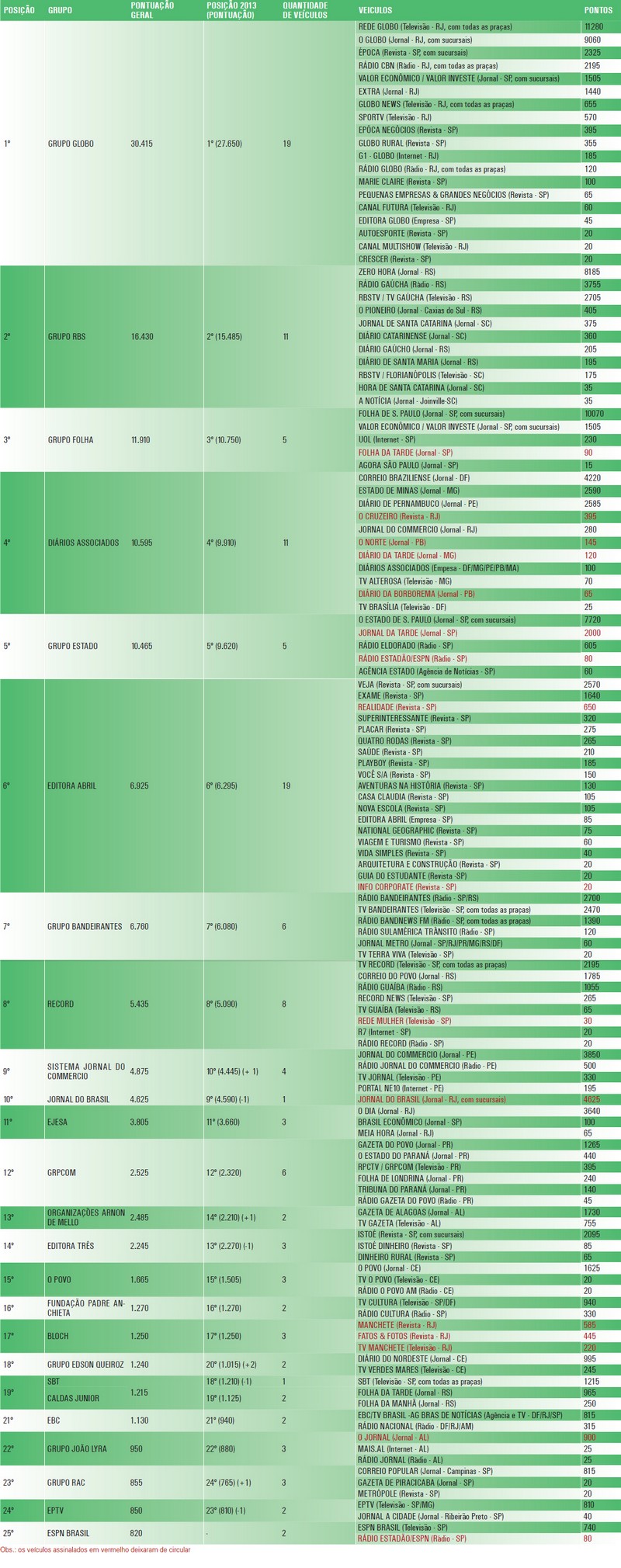 O terceiro lugar ficou com o Grupo Folha, com 11.910 pontos, seguido do Diários Associados, com 10.595 e do Grupo Estado, com 10.465.