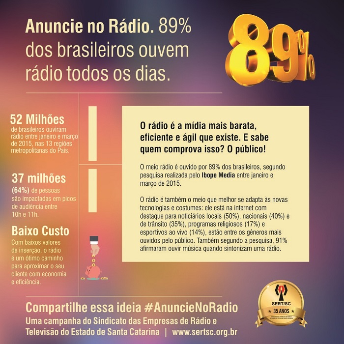 10/07/2015Com base na pesquisa realizada no primeiro trimestre de 2015 pelo Instituto Ibope Media o Sindicato das Empresas de Rádio e Televisão do Estado de Santa Catarina – SERT/SC está lançando a campanha “Anuncie no rádio”.