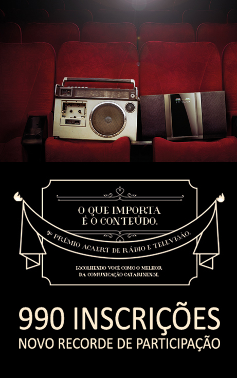 05/08/2015O Prêmio ACAERT de Rádio e Televisão, 9ª edição, recebeu a inscrição de 990 trabalhos, quebrando, desta forma, o recorde de participação. Estão concorrendo profissionais de Rádio e Televisão, publicitários das agências com sede ou representação em Santa Catarina, além de estudantes de jornalismo e publicidade. As inscrições on line foram realizadas de 16 de junho a 31 de julho. Agora, nove jurados, divididos em três categorias, analisarão os trabalhos durante o mês de agosto. São profissionais de Porto Alegre, São Paulo e Rio de Janeiro, representantes do mercado nacional e de importantes instituições de ensino, como a USP, Cásper Líbero e ESPM/Sul. Os três finalistas de cada modalidade serão conhecidos em setembro.
