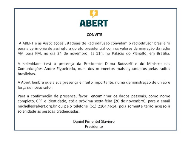 17/11/2015Radiodifusores de todo o país estarão presentes à assinatura do ato com os valores da migração do rádio AM para FM na próxima terça-feira (24), no Palácio do Planalto.