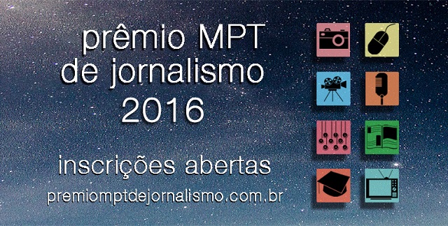 Estão abertas, de 25 de janeiro e 6 de maio, as inscrições para a edição 2016 do Prêmio MPT de Jornalismo. Podem participar jornalistas, fotógrafos, repórteres cinematográficos e estudantes de jornalismo em oito categorias: jornal impresso, revista impressa, radiojornalismo, telejornalismo, webjornalismo, fotojornalismo, universitário e repórter cinematográfico. As inscrições devem ser feitas exclusivamente pelo site www.premiomptdejornalismo.com.br e serão encerradas às 18 horas do dia 6 de maio. Podem concorrer reportagens publicadas em veículos de comunicação de todo o país no período de 2 de maio de 2015 a 6 de maio de 2016.