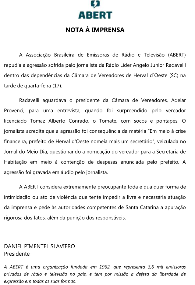 18/02/2016A Associação Catarinense de Emissoras de Rádio e Televisão – ACAERT vem a público manifestar repúdio contra a agressão sofrida pelo jornalista Angelo Junior Radavelli, da Rádio Líder, na tarde da última quarta-feira dentro das dependências da Câmara de Vereadores de Herval D’ Oeste.