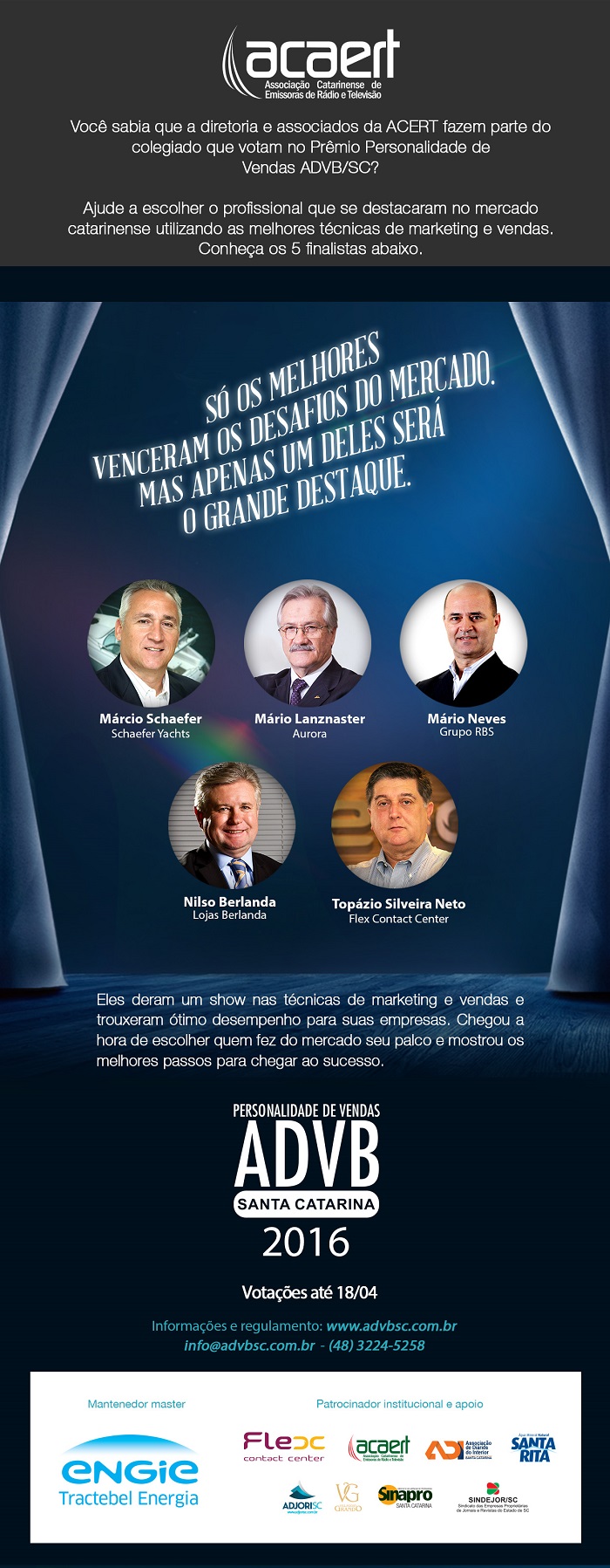 A Associação dos Dirigentes de Vendas e Marketing do Brasil/ Seccional Santa Catarina – ADVB/SC promove a escolha do Personalidade de Vendas ADVB/SC, que destaca o talento de um profissional da área no Estado. São finalistas: Mário Neves (RBS TV), Márcio Schaefer (Schaefer Yachts), Mário Lanznaster (Cooperativa Central Aurora Alimentos), Nilso Berlanda (Lojas Berlanda) e Topázio Silveira Neto (Flex Contact Center). Conheça mais sobre os finalistas abaixo.