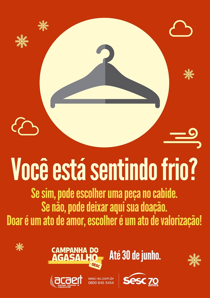 “Ajude a esquentar o inverno de quem precisa” é o lema desta edição da Campanha do Agasalho, realizada pelo Sesc em Santa Catarina, em parceria com a Associação Catarinense de Emissoras de Rádio e Televisão (Acaert). As Unidades do Sesc no Estado são pontos de coleta e as doações podem ser entregues até 30 de junho. O projeto mobiliza a sociedade para arrecadação de roupas de inverno, calçados, cobertores e mantas, em bom estado de uso, para serem destinados às instituições e comunidades carentes. Todo o ano, a Instituição promove a campanha, com o objetivo de sensibilizar as pessoas sobre a importância do ato de doar.