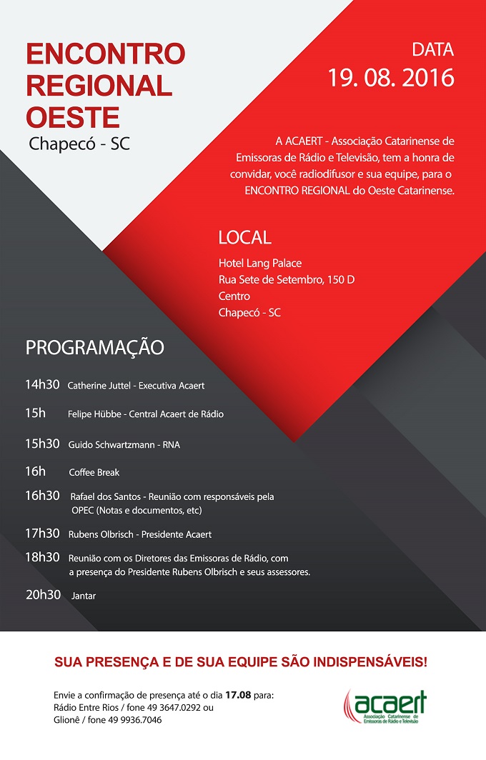 02/08/2016Associação Catarinense de Emissoras de Rádio e Televisão - ACAERT definiu a data e o local da próxima reunião regional. O encontro da Regional 6 - Oeste acontecerá no dia 19 de agosto, sexta-feira, no município de Chapecó. O evento acontecerá no Hotel Lang Palace, localizado na Rua Sete de Setembro, Nº150D, Centro.