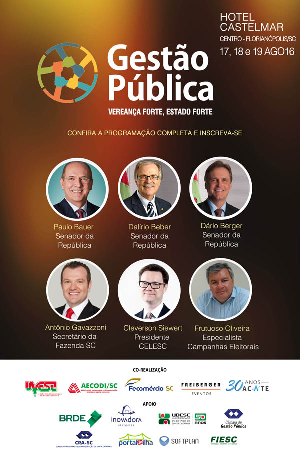 O evento reunirá como palestrantes os três senadores catarinenses Dário Berger, Dalírio Beber e Paulo Bauer, Antônio Gavazzoni, Secretário da Fazenda do Estado de SC, Cleverson Siewert, presidente da CELESC, além de representantes do TRE/SC, Ministério Público, Tribunal de Contas, empresários e especialistas em gestão pública.