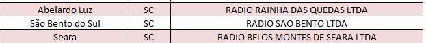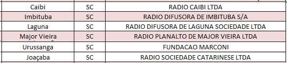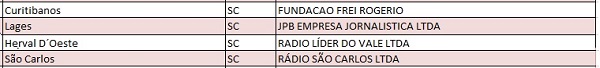 Na lista estão as emissoras que já receberam o boleto e ainda não efetuaram o pagamento da diferença de outorga (6 em SC), as que irão receber o boleto nos próximos dias (4 em SC), além daquelas que estão com exigências a ser atendidas (3 em SC). De acordo com a divulgação, 32 novos boletos foram emitidos.