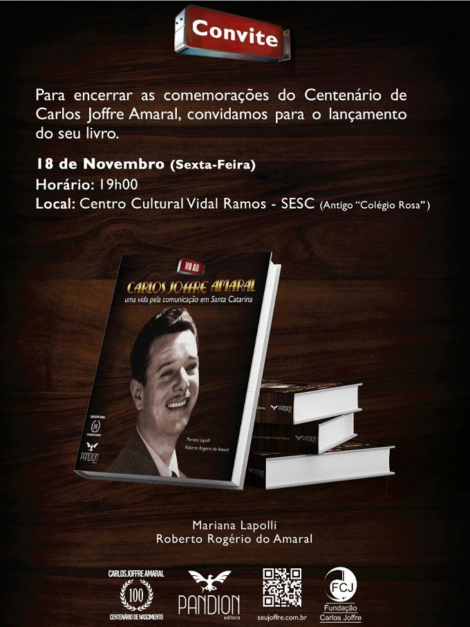 16/11/2016Para encerrar as comemorações do Centenário de Nascimento de Carlos Joffre Amaral, o Sistema Catarinense de Comunicações realizará, no dia 18 de novembro, às 19h, no Centro Cultural Vidal Ramos - SESC, em Lages, o lançamento oficial do livro que conta a história de um dos principais pioneiros da comunicação no estado. Escrito por Mariana Lapolli e Roberto Rogério do Amaral, a obra está sendo publicada pela editora Pandion. O evento integra uma série de ações que celebraram, ao longo de todo o ano, os cem anos de nascimento de Carlos Joffre e contou com uma homenagem da Assembleia Legislativa do Estado de Santa Catarina, além de também ter sido comemorado no evento que celebrou os 35 anos do SBT Santa Catarina.