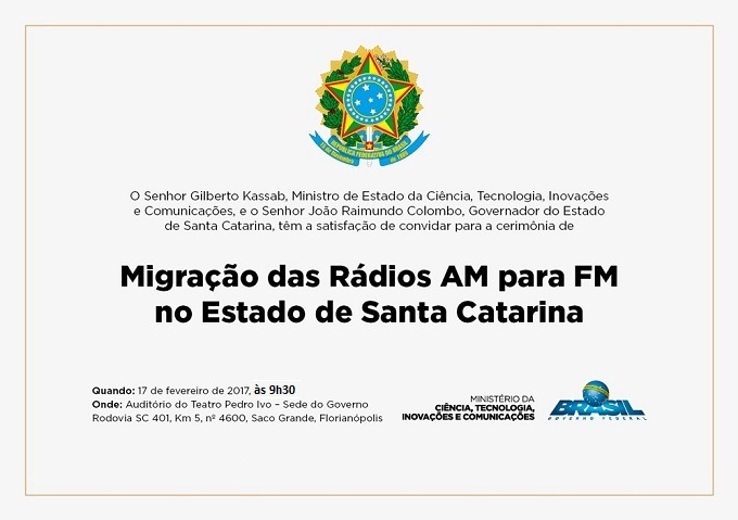 O Ministério de Ciência, Tecnologia, Inovações e Comunicações - MCTIC vai realizar mutirões estaduais para agilizar o processo de Migração das rádios do AM para o FM. Santa Catarina será o primeiro estado do Brasil a receber os representantes do ministério. O evento está programado para o dia 17 de fevereiro, às 09h30, no teatro Pedro Ivo Campos, em Florianópolis.