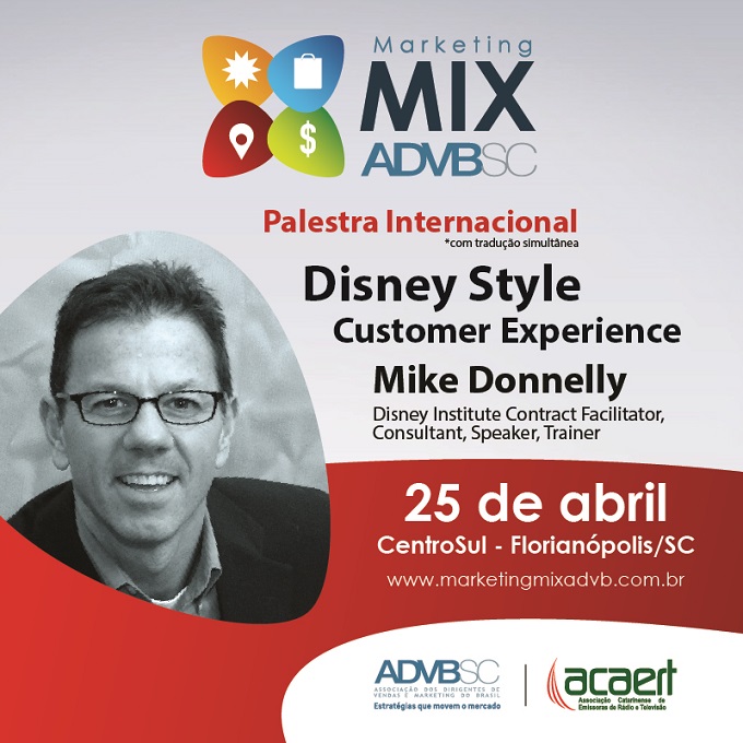 A primeira edição do Marketing Mix ADVB/SC, promovido pela Associação dos Dirigentes de Vendas e Marketing de Santa Catarina, trará pela primeira vez ao Estado Mike Donnelly, reconhecido especialista, palestrante, facilitador e consultor em técnicas de como construir culturas corporativas bem-sucedidas. Por mais de 25 anos, Mike ganhou experiência prática em liderança atuando na The Walt Disney Company e na Papa John's International.