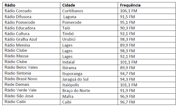 12/06/2017Santa Catarina ganhou seis novas FMs nos últimos meses, todas emissoras que nasceram no AM e concluíram o processo de migração. São elas: Rádio Coroado de Curitibanos - 106,1 FM; a Rádio Difusora de Laguna – 91,5 FM; a Rádio Pomorode – 95,1 FM; Rádio Educadora de Taió – 90,3 FM; Rádio Cultura de Timbó – 92,1 FM; e a rádio Gralha Azul de Urubici – 98,3 FM. Com isso, o estado já totaliza 17* emissoras que migraram do AM para o FM.