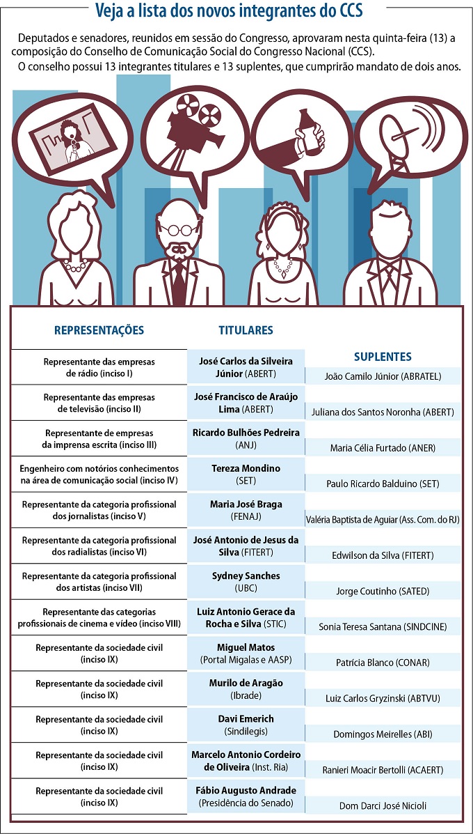 O conselho possui 13 integrantes titulares e 13 suplentes, que cumprirão mandato de dois anos, sendo três representantes de empresas de rádio, televisão e imprensa escrita; um engenheiro especialista na área de comunicação social; quatro representantes de categorias profissionais e cinco representantes da sociedade civil.