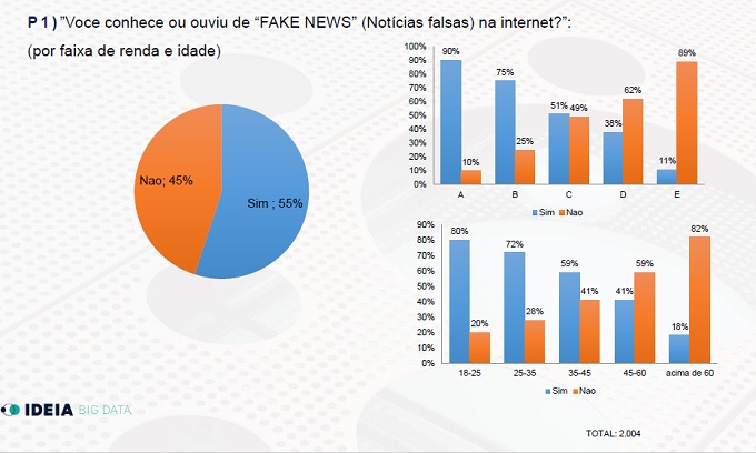Considerando-se o total dos entrevistados, sem levar em conta os níveis de renda específicos, 63% das pessoas ouvidas afirmam não se preocupar em checar a veracidade das notícias antes de compartilhá-las, afirma a reportagem da Veja. Outro dado preocupante é o número de pessoas nunca ouviram falar em Fake News, 45% dos brasileiros.