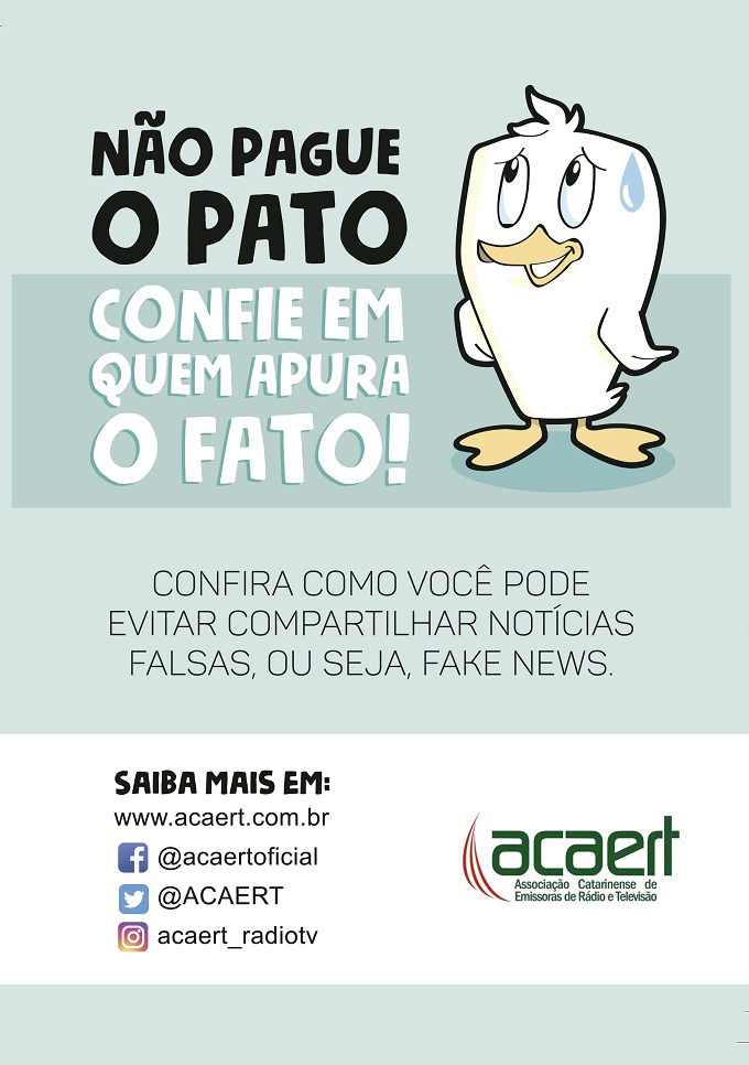 A Associação Catarinense de Emissoras de Rádio e Televisão - ACAERT lança a campanha: "Não Pague o Pato. Confie em quem apura o Fato. Rádio e Televisão, veículos essenciais, comprometidos com a verdade"