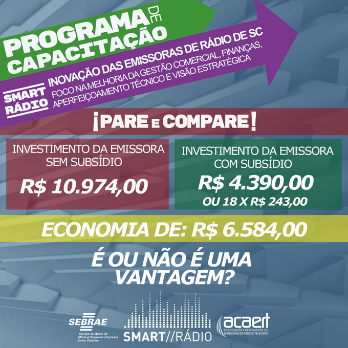 Programa de capacitação, atualização e aperfeiçoamento oferecido pelo SEBRAE/SC, em parceria com a ACAERT. Conteúdo oferecido de acordo com demanda dos radiodifusores. Maior investimento da ACAERT em 2019.