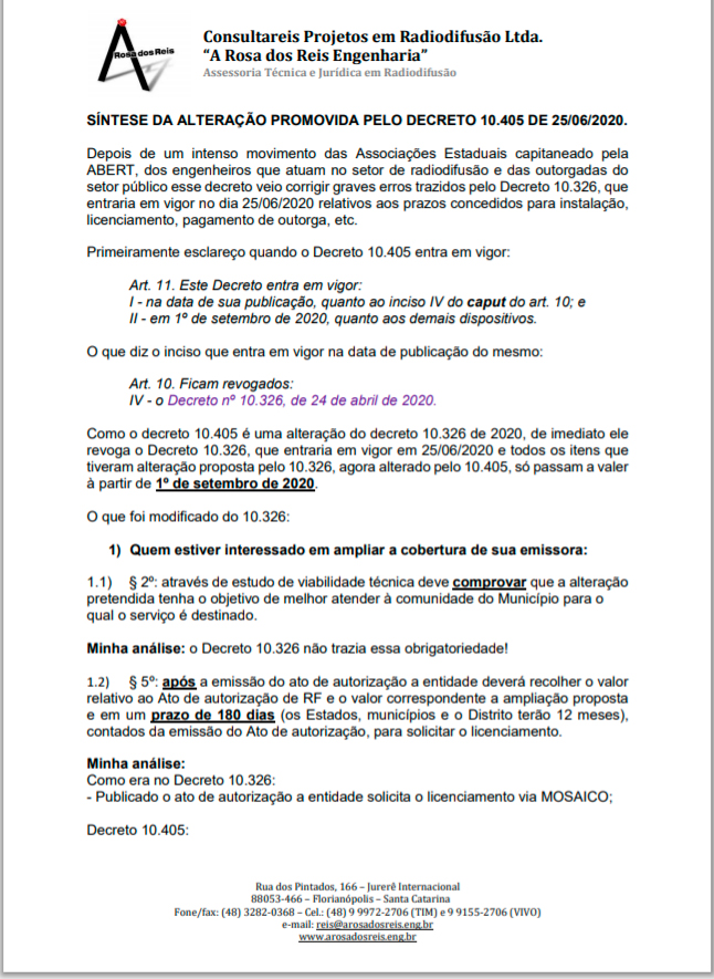 03/07/2020O assessor técnico da ACAERT, engenheiro Luiz Rosa dos Reis, publicou uma SÍNTESE DA ALTERAÇÃO PROMOVIDA PELO DECRETO 10.405 DE 25/06/2020.
