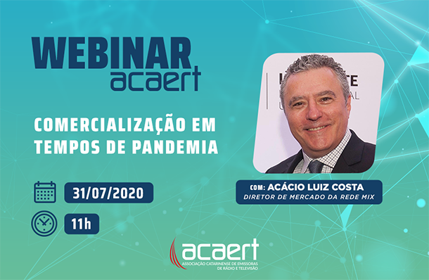 Já estão abertas as inscrições para o Webinar ACAERT com o tema “Comercialização em tempo de pandemia”, com o diretor de Mercado da Rede Mix, Acácio Luiz Costa. O evento será realizado no dia 31/07 (sexta-feira), às 11 horas. As inscrições são gratuitas e podem ser feitas no link: https://materiais.acaert.com.br/comercializacao-pandemia