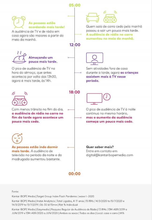 Vários hábitos foram alterados, conforme destacado pelo tudoradio.com em sua redação, nesta segunda-feira (17), tomando como base os dados divulgados pela Kantar Ibope Media. No infográfico, o instituto de pesquisa apontou que o horário forte de audiência que acontecia mais cedo para quem estava em deslocamento pela manhã foi deslocado para o meio do período matinal, ou seja, mais tarde.