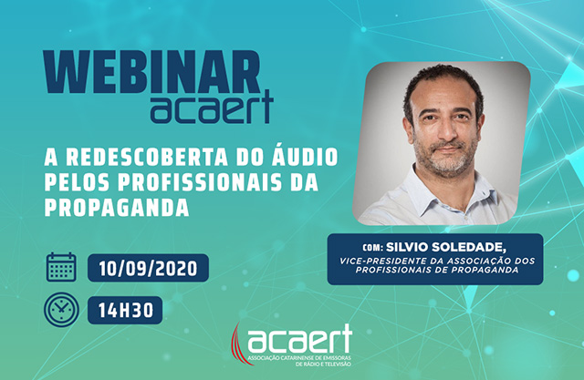 O próximo Webinar ACAERT será no dia 10 de setembro, às 14h30, com o vice-presidente da Associação dos Profissionais da Propaganda, Silvio Soledade, que profere palestra sobre “A redescoberta do áudio pelos profissionais da propaganda”. A mediação ficará com o conselheiro da ACAERT, Nelson Paulo dos Santos. Evento voltado para radiodifusores, profissionais de Rádio e Televisão, publicitários e acadêmicos. Debate sobre o que essa redescoberta pode impactar nos investimentos em mídia principalmente no veículo Rádio. Como despertar o interesse de criativos e agências para produzir conteúdo realmente relevante e impactante em áudio. Inscrições gratuitas.