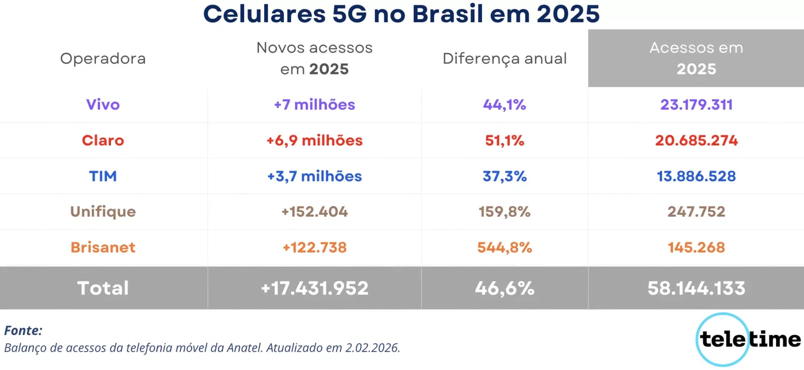 A Claro teve crescimento semelhante ao da concorrente. A companhia recebeu 6,9 milhões de novos acessos na tecnologia, o que fez com que sua base de clientes conectados na quinta geração móvel subisse para 20,6 milhões em 2025.