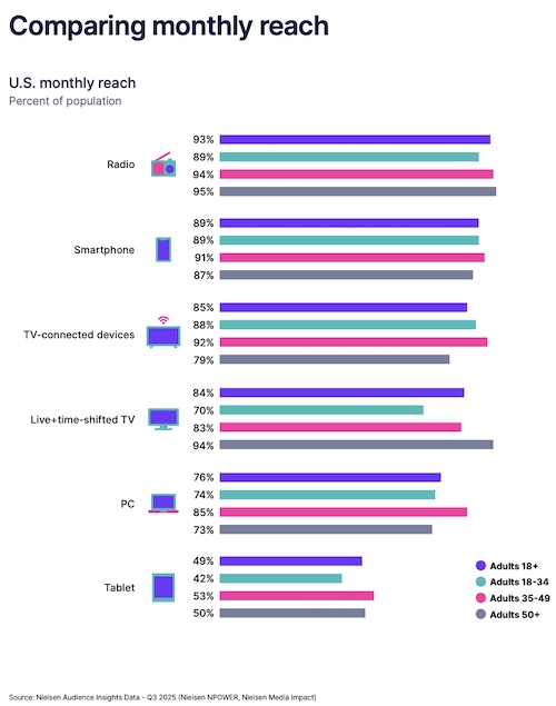 O relatório Audio Today 2026, divulgado pela Nielsen, reforça o protagonismo do rádio no consumo de áudio nos Estados Unidos ao apontar que o meio alcança 93% dos adultos mensalmente (pessoas com 18 anos ou mais), lidera com folga o tempo de escuta de áudio com publicidade (61% do total diário) e ainda figura entre os canais com maior retorno sobre investimento (ROI), mesmo diante de uma percepção de eficácia inferior por parte do mercado publicitário. Os dados respondem a uma série de recortes feitos por perfis na internet que indicam uma eventual liderança dos podcasts perante o rádio, que se trata de conteúdo falado e é uma plataforma de áudio amplamente impulsionada pelo próprio setor de radiodifusão nos EUA. Acompanhe os detalhes: