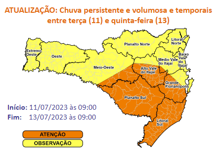 Defesa Civil de SC orienta cuidados com projeção de intensificação de chuva e ventos nesta quarta-feira